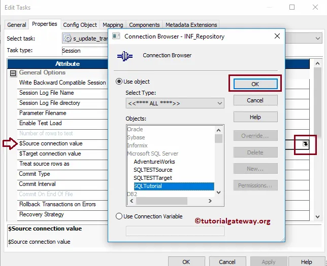 $Source connection value: This property will store the relational source information in the $Source variable. So, click on the Arrow we marked below, and select the SQL Tutorial as the source information.