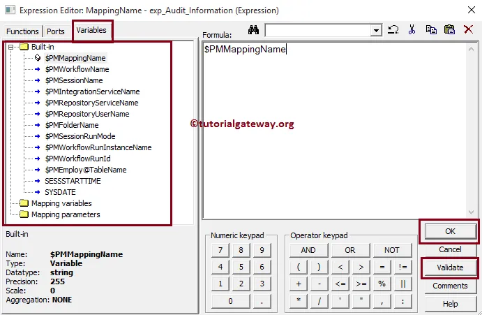 It opens the Expression Editor to write a custom expression. Here, we want the Mapping Name. So, please go to the Variables Tab and select one of the Built-in Variables called $PMMappingName.