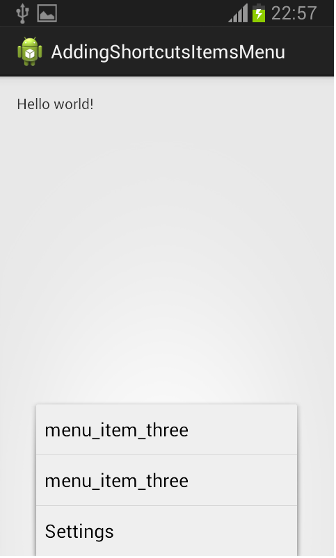 Here is source code of the Program to Demonstrate Adding Shortcuts to Items in a Menu in Android. The program is successfully compiled and run on a Windows system using Eclipse Ide. The program output is also shown below.