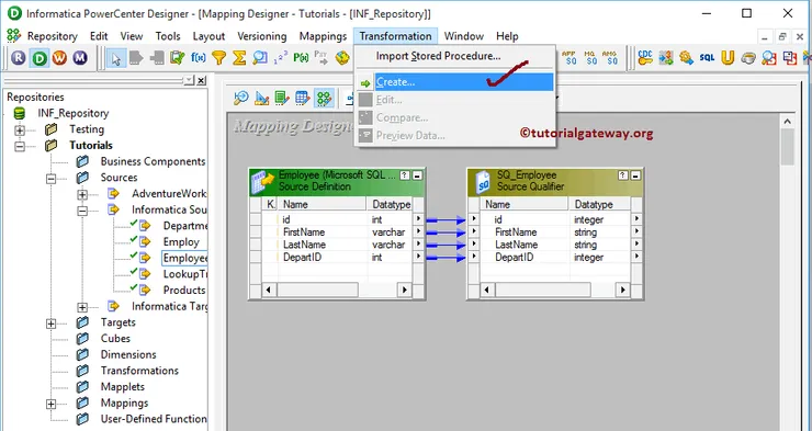 Next, Drag and drop the [Employee] source definition from Sources folder to the mapping designer. Once you drag the source, the PowerCenter designer will automatically create the default transformation called source qualifier.