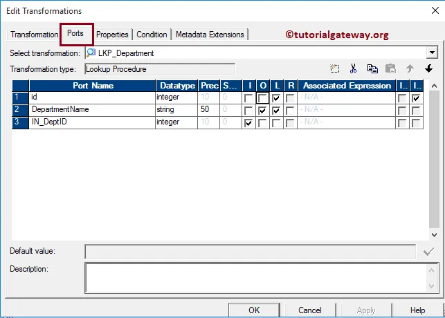 Within the condition tab, we added one condition id = IN_DeptID. Below condition states that whenever this lookup transformation is called they have to provide the parameter value of integer data type.