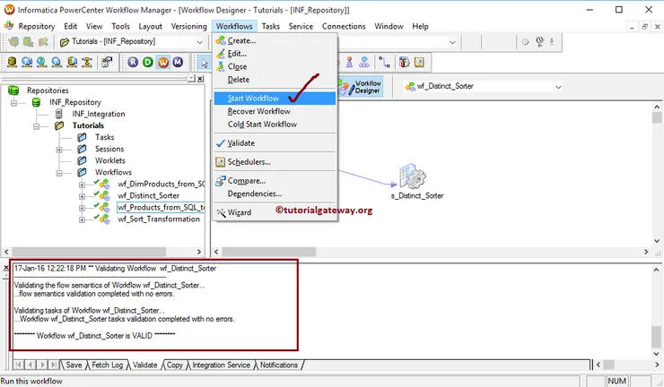 From the below screenshot, you can observe that the Remove Duplicates Using Sorter Transformation in Informatica workflow is a valid one. Now, let us start the Workflow by navigating to the Workflows menu and selecting the Start Workflow option.