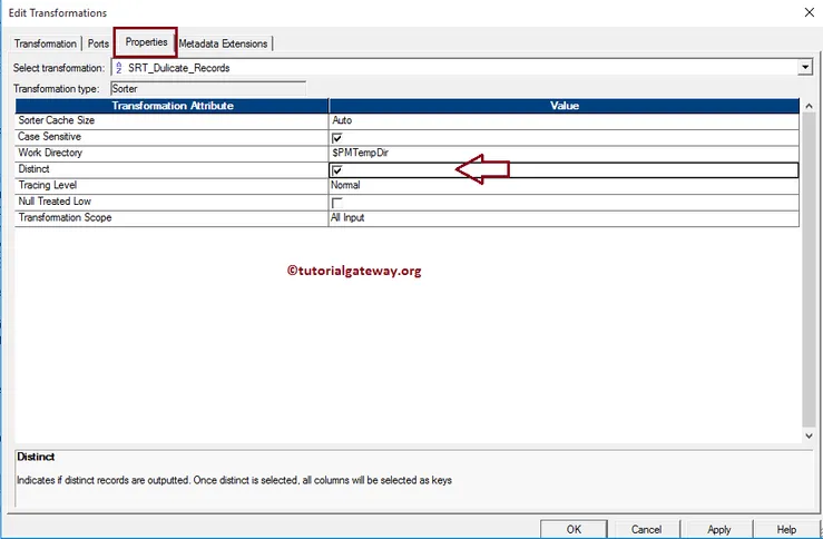 Double click on the Sorter transformation to configure the properties. From the below screenshot, you can observe the list of available properties in Properties tab. In this example, we want to remove duplicate records so, checkmark the Distinct property.