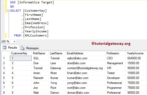 Please navigate to Target Designer to define the Target. In this example, we are using the existing SQL table (XMLCustomers) as our target definition. You can refer to Create a Target table using Source Definition to understand the process of creating a target definition