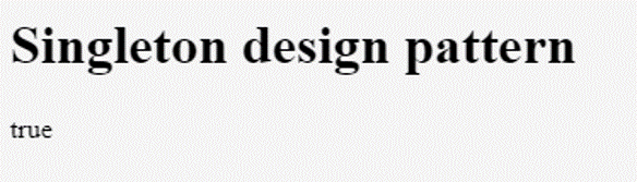 var firstInstance = singletonPatternDemo.getsingleInstance(); var secondInstance = singletonPatternDemo.getsingleInstance(); document.write( firstInstance === secondInstance ); // true