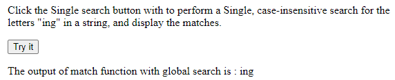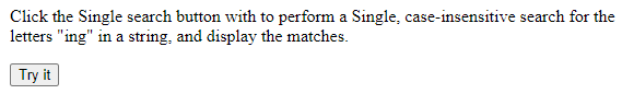 <p>Click the Single search button with to perform a Single, case-insensitive search for the letters "ing" in a string, and display the matches.</p>