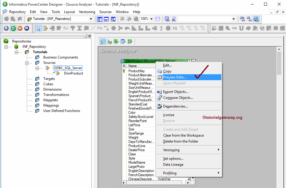 Although we imported our source from the SQL database, before we proceed further we should preview our data. In order to preview the source data, Right click on the table definition and select the Preview data.. option from the context menu.